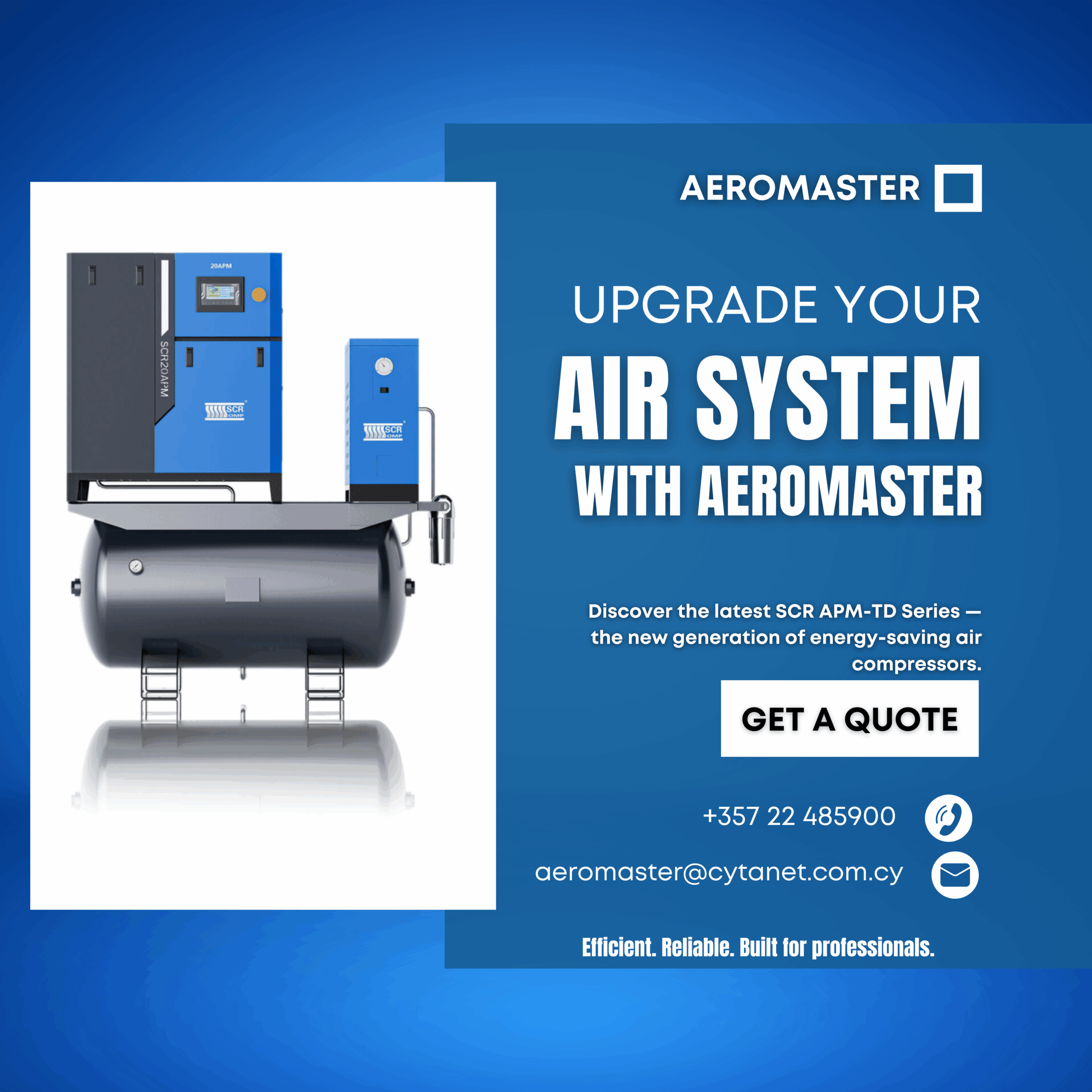 AEROMASTER’s industrial air compressors in Cyprus are built to deliver maximum power, efficiency, and reliability under the toughest conditions. Designed for continuous use in factories, machine shops, and production lines, they provide consistent high-capacity airflow for any demanding industrial application. From rotary screw compressors to high-volume piston units, our range offers the ideal solution for businesses that need performance, energy efficiency, and long-term durability.